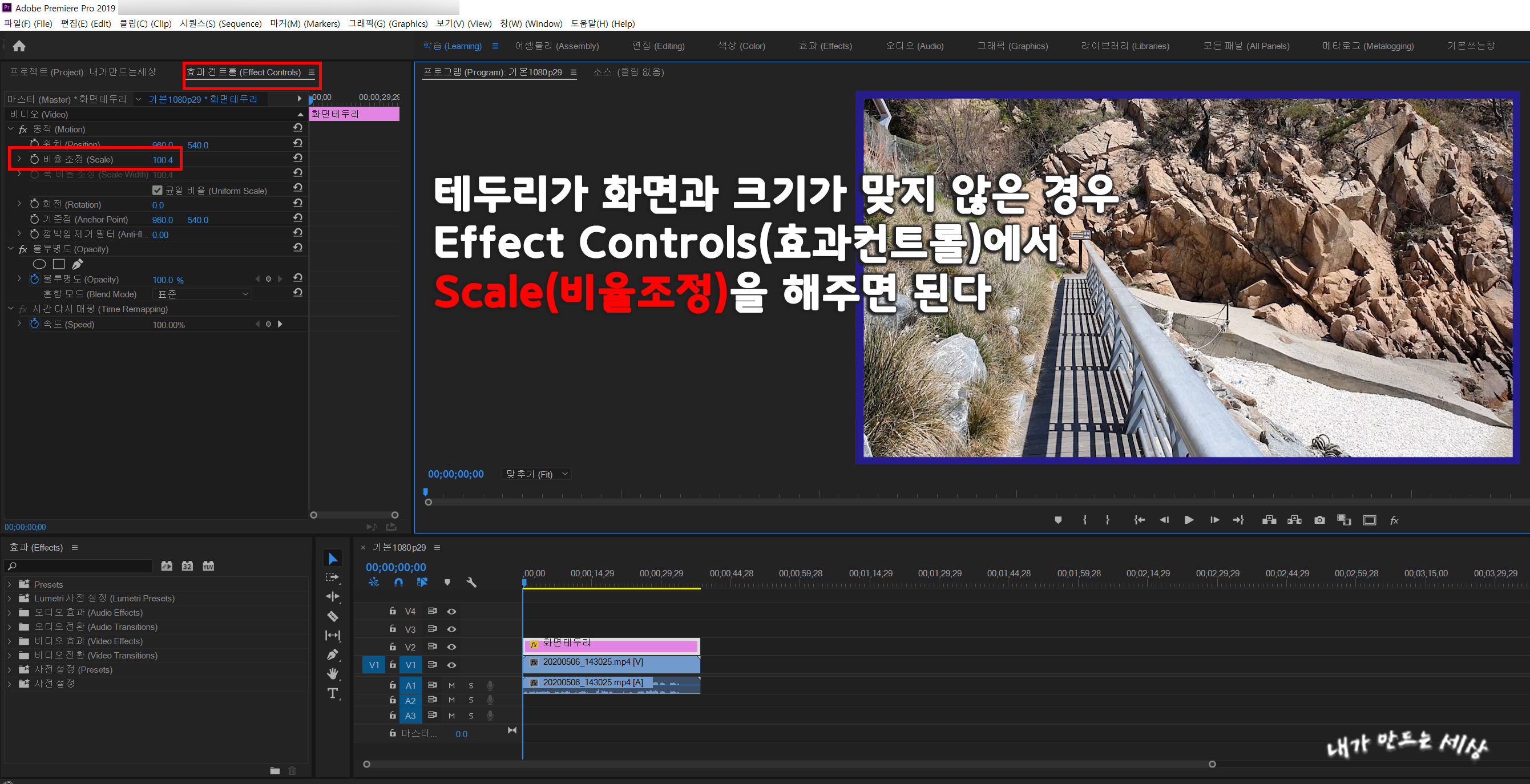 왼쪽 상단에 Effect Controls(효과 컨트롤)에서 Scale(비율 조정)을 해주면 됩니다