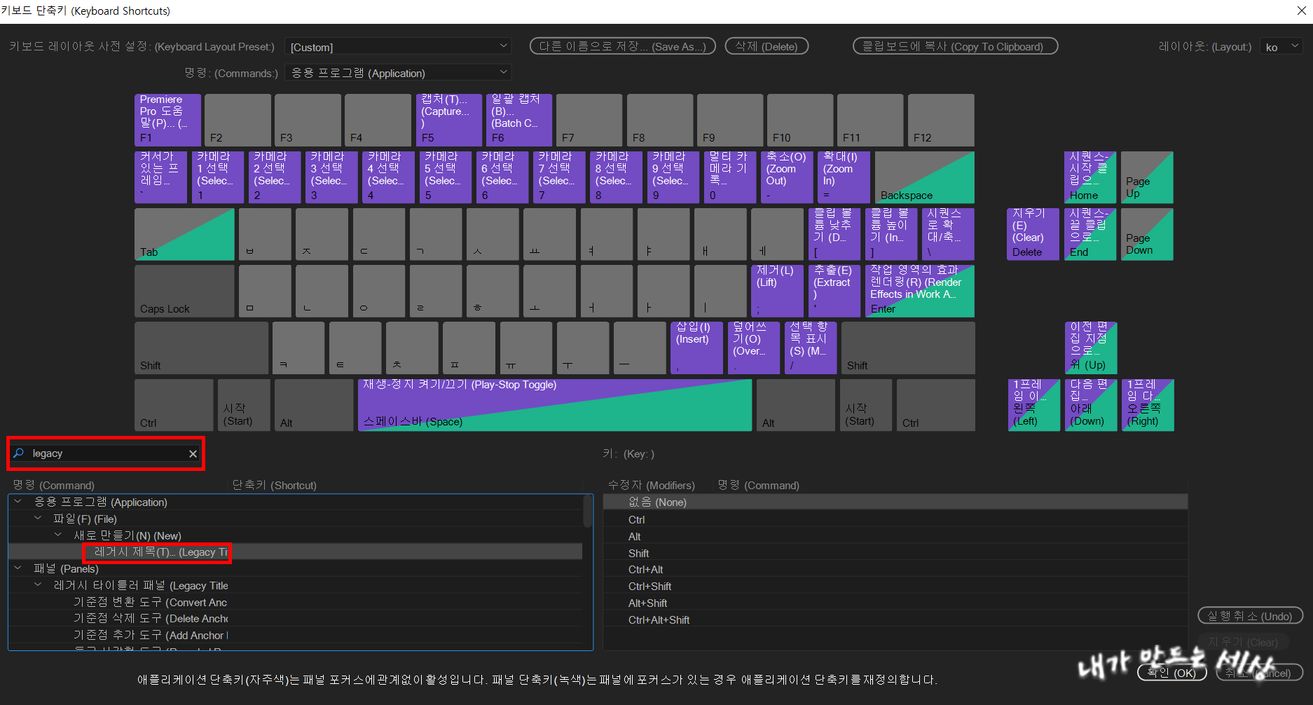 전에 포스팅에서 레거시 타이틀을 이용해 영상 화면에 테두리를 설정하는 방법에 대해 올렸습니다. 레거시 타이틀은 예능 자막을 넣게 될때 자주 사용하게 되는데 단축키가 지정되어 있지 않아 불편한 점이 있습니다. 그래서 오늘은 프리미어프로에서 키보드 단축키를 설정하는 방법을 알려드리려고 합니다