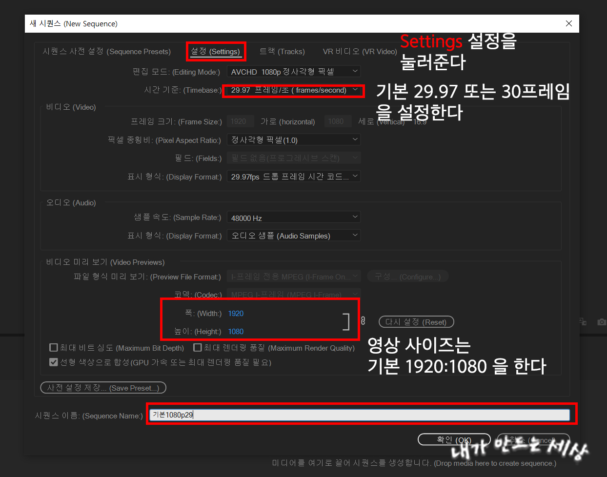 Timebase는 초당 프레임 수를 지정해주는 건데 기본적으로 29.97 또는 30 프레임을 설정합니다