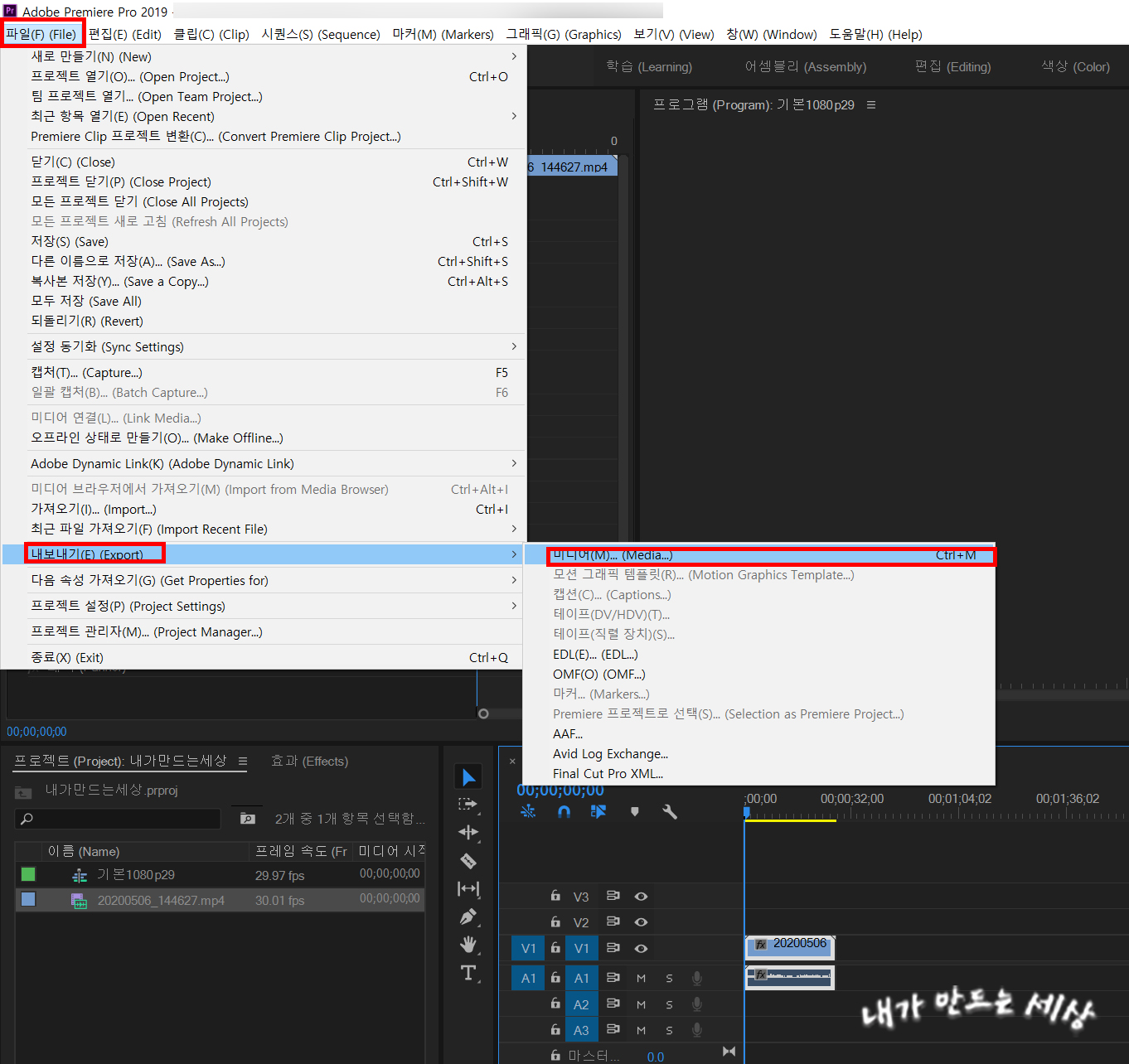12. 영상편집이 다 끝나고 영상 출력을 하려면 상단 메뉴에서 파일을 클릭하고 하단 쪽에 Export(내보내기)를 클릭하면 미디어를 클릭해줍니다 (단축키 Ctrl+M)