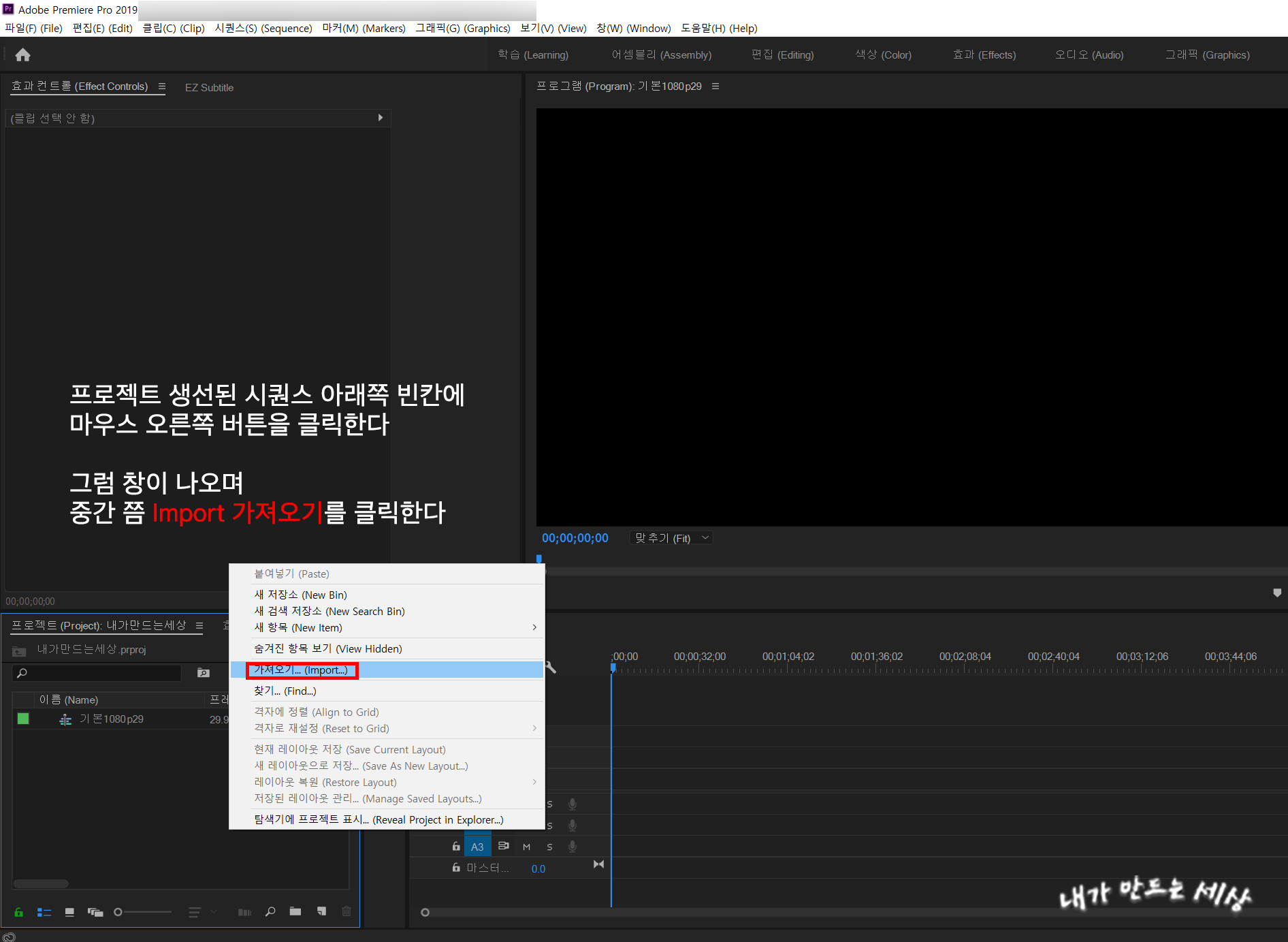 10. 편집할 영상 및 이미지, 오디오 파일을 눌러오려면 프로젝트 창에서 빈 공간에서 마우스 오른쪽 버튼을 클릭하면 창이 뜹니다