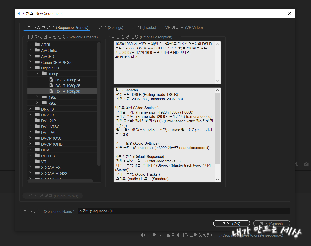 맨 하단에 시퀀스 이름을 지정해주고 OK 확인 버튼을 클릭합니다