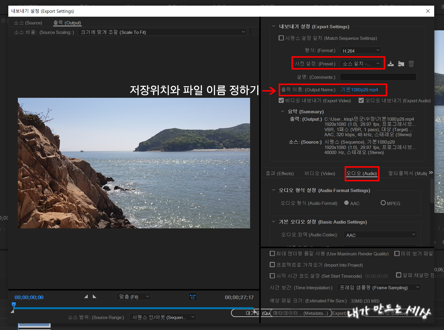 14. Output Name(출력 이름)에 파란색으로 되어 있는 이름을 클릭하면 저장 위치와 파일 이름을 설정하면 된다