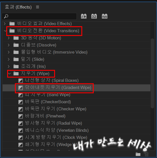 5. 왼쪽 하단에 Effects(효과)창에서 Video Transitions(비디오 전환)을 클릭하고 Wipe(지우기)를 클릭합니다