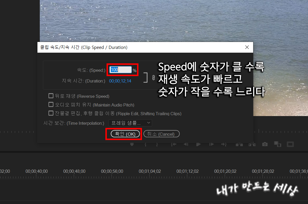 5. 프리미어 프로 빨리 감기 새창이 나오고 Speed(속도) 란에 숫자가 클수록 재생 속도가 빠르고 숫자가 낮을수록 영상 재생 속도가 느려집니다