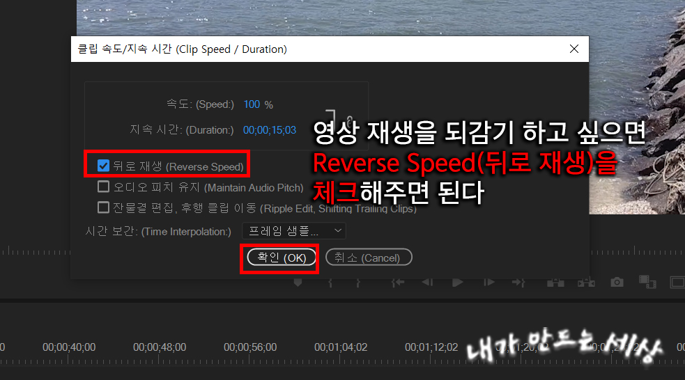 Reverse Speed(뒤로 재생)에 체크해주고 확인을 클릭합니다
