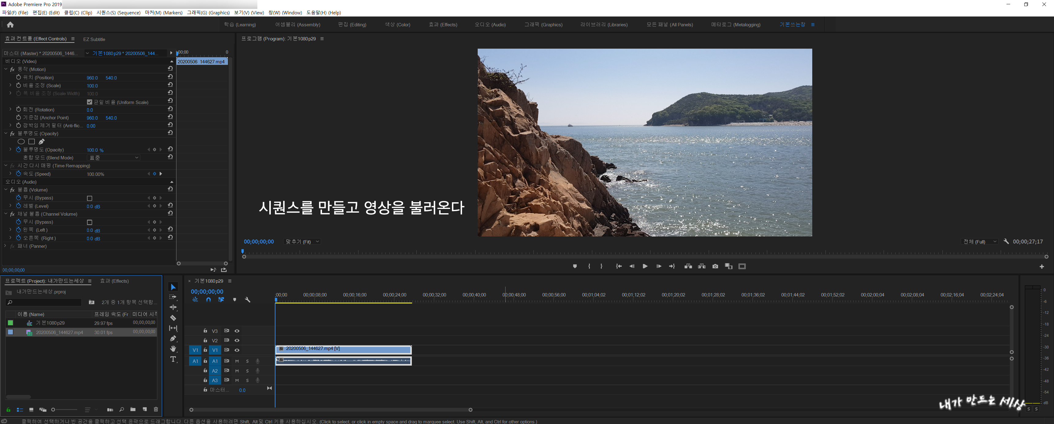 1. 프리미어 프로를 실행 후 시퀀스를 만들어줍니다. 프리미어프로 빨리 감기 또는 되감기 할 영상을 불러옵니다