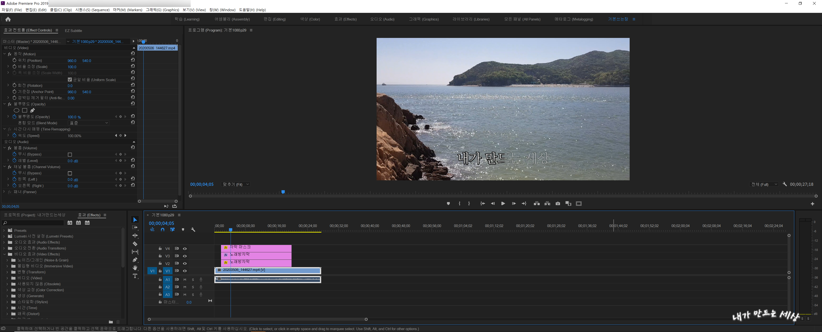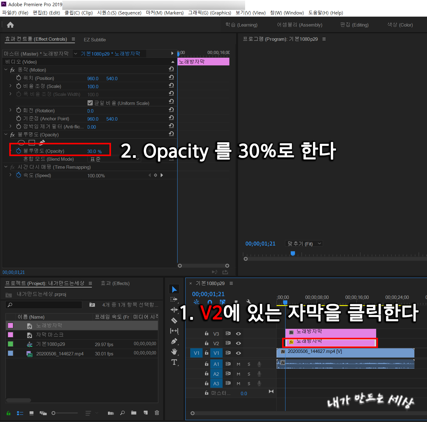 어도비 프리미어프로 CC2019를 이용하여 노래방 자막처럼 자막을 만들어 보는 방법에 대해 알려드리려고 합니다. 내용을 잘 보고 따라해주세요
