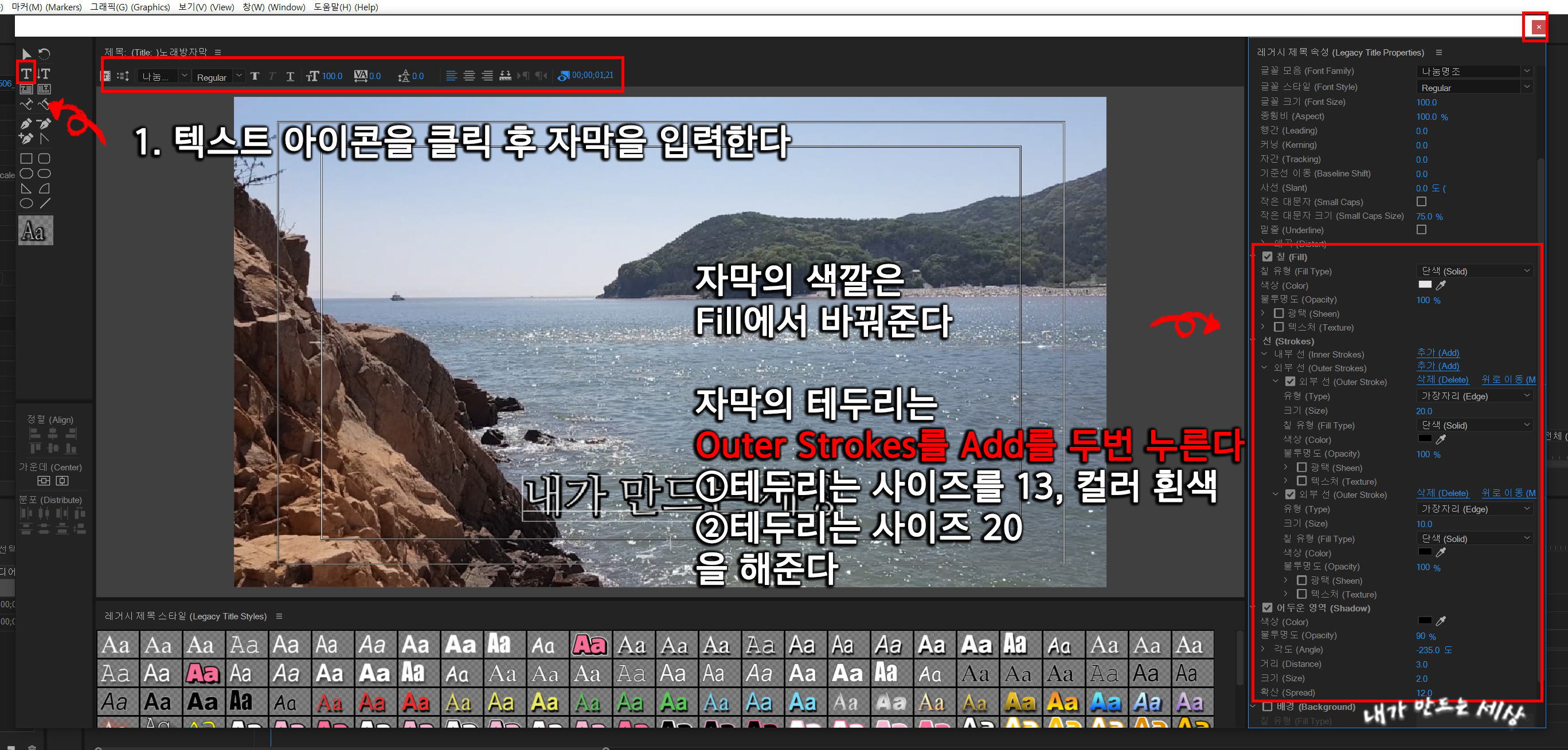 자막의 테두리는 오른쪽에 Outer Strokes에서 Add를 두 번
