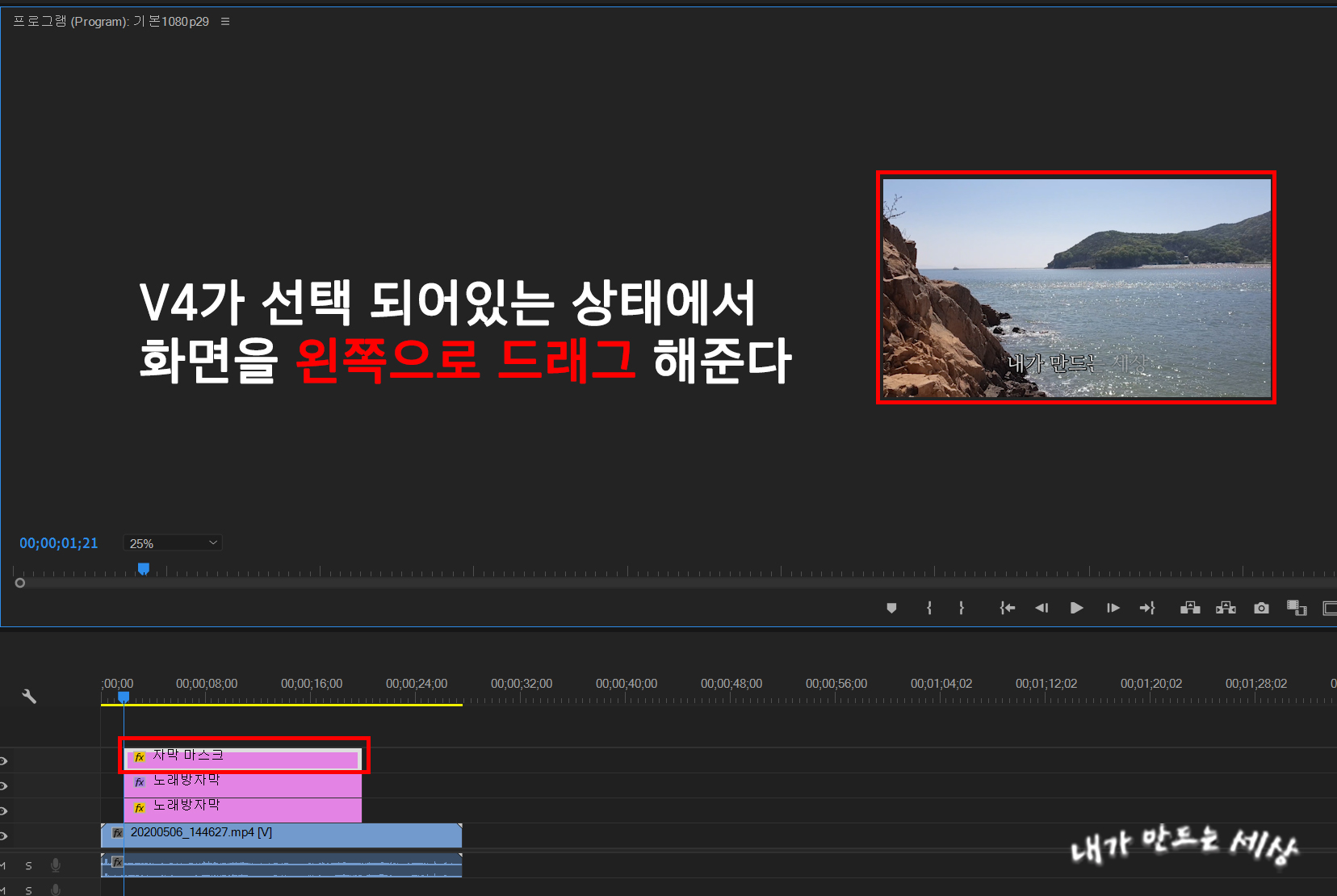 22. V4가 선택되어 있는 상태에서 (자막 마스크가 만들어진 클립) 화면을 왼쪽으로 드래그해주면서 자막이 잘 안 보이게 합니다