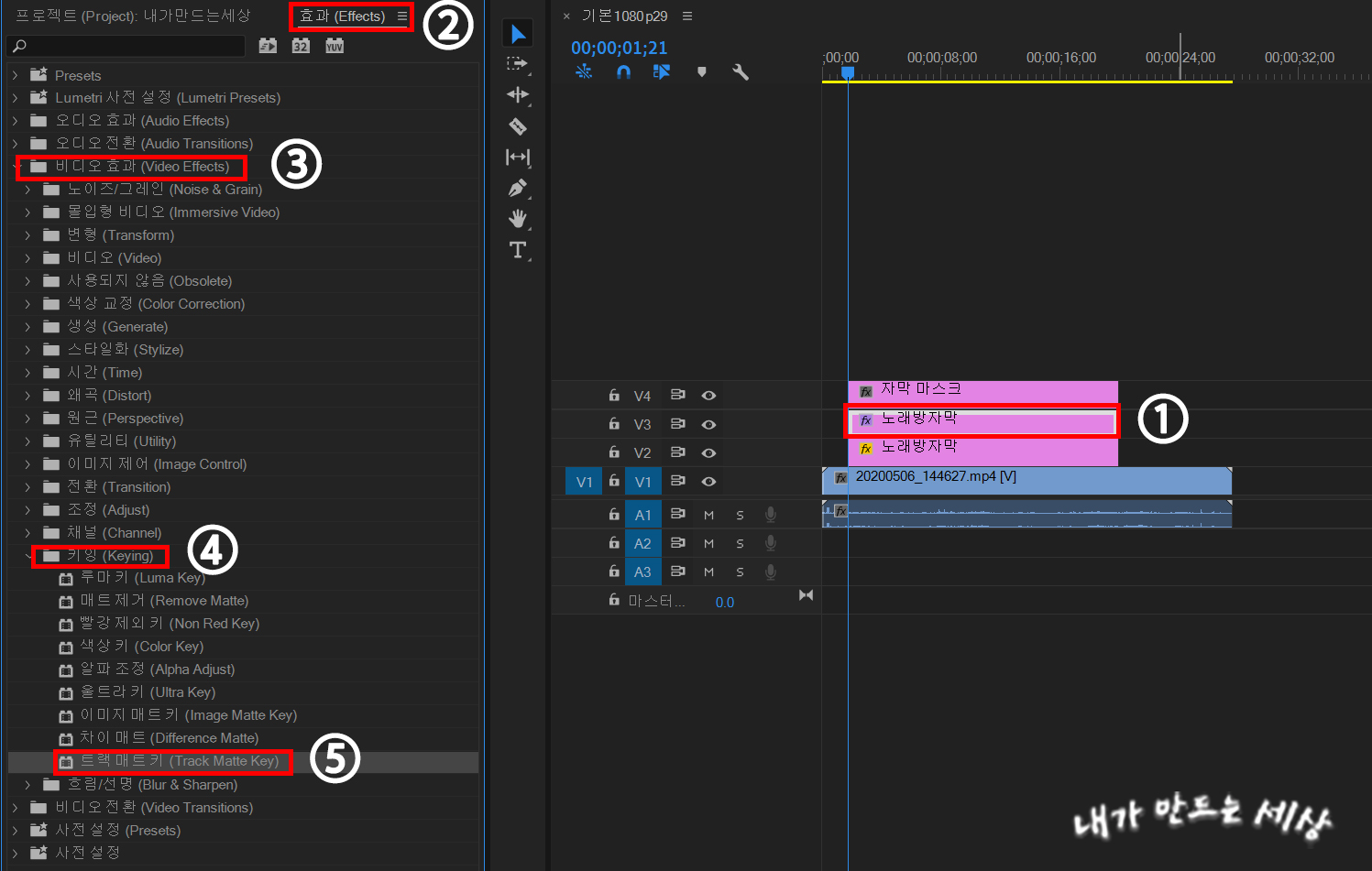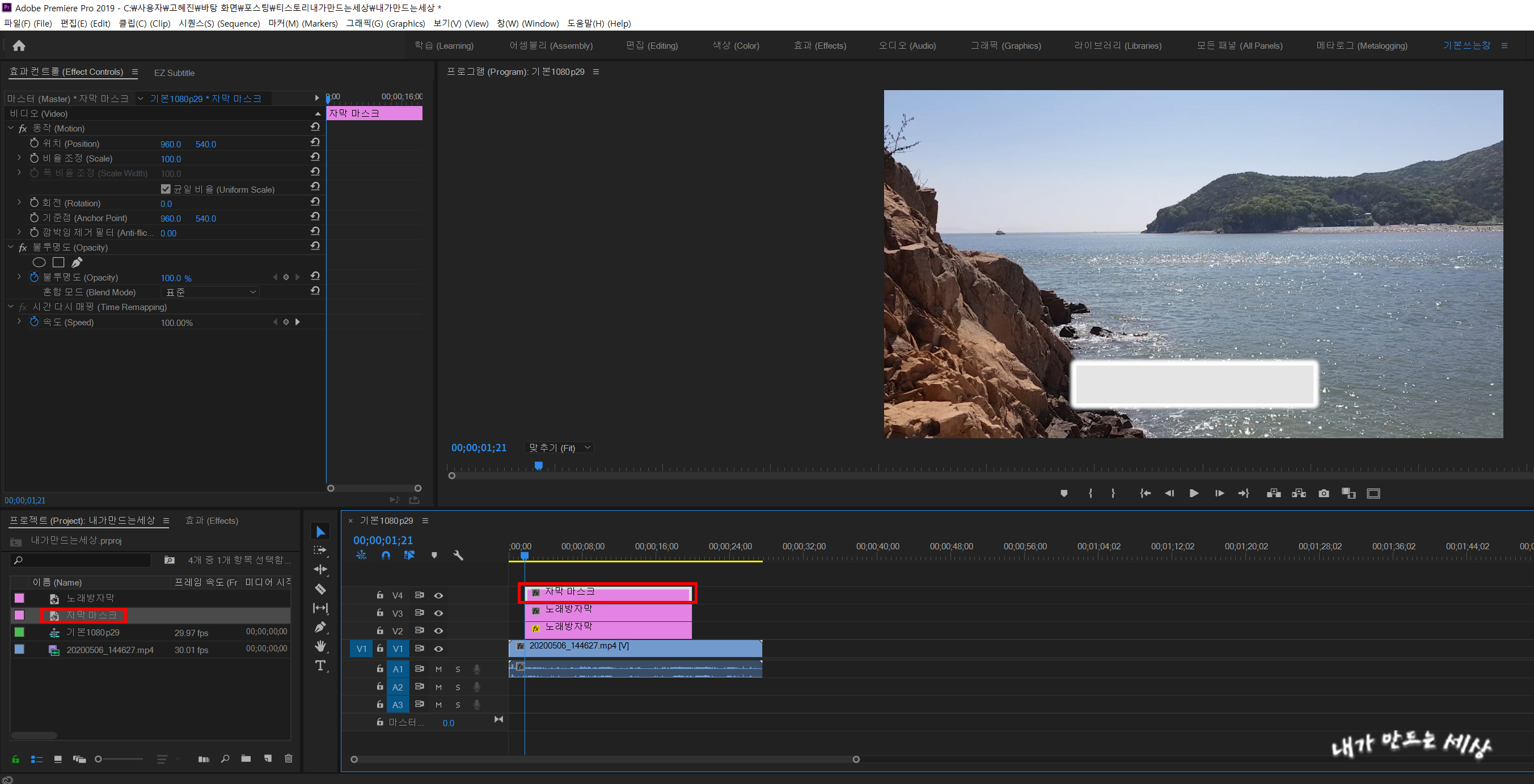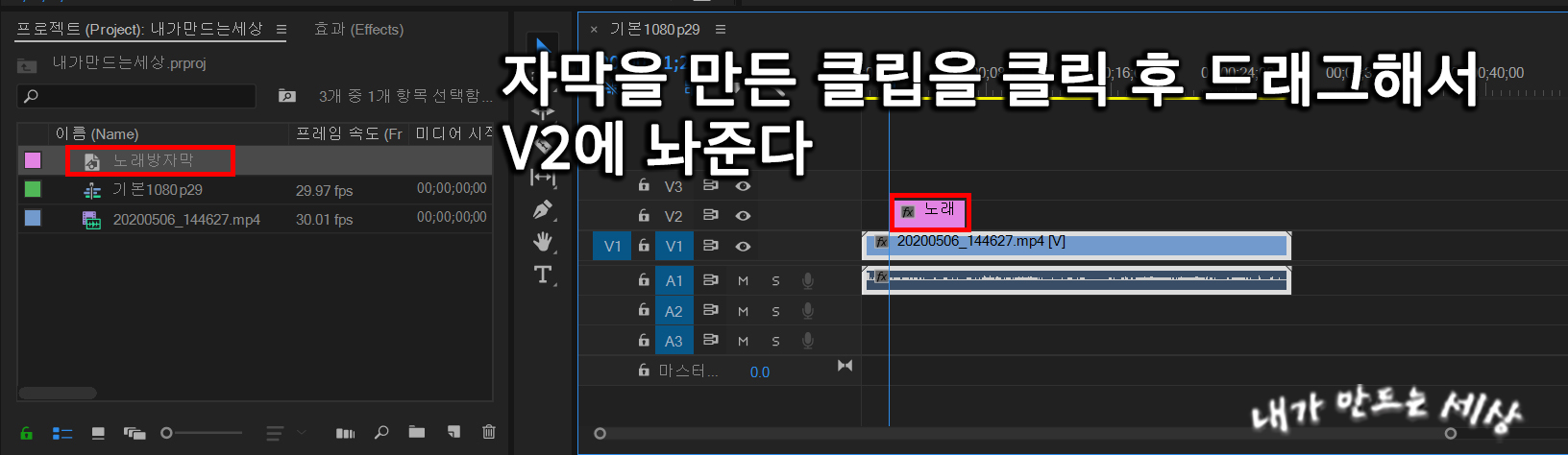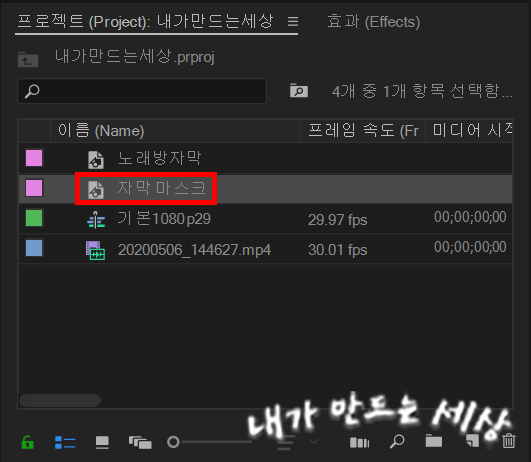 17. 프로젝트 창에 만들었던 자막 마스크를 클릭한 후 드래그해서 V4에 놓습니다