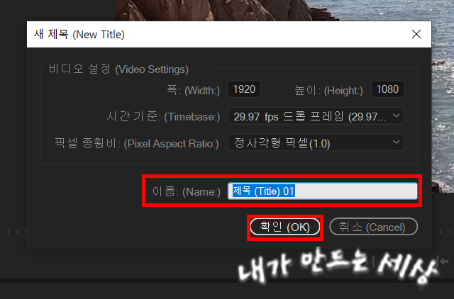 5. 프리미어프로 레거시 타이틀 파일 이름을 지정해주면 아래 사진처럼 창이 뜹니다