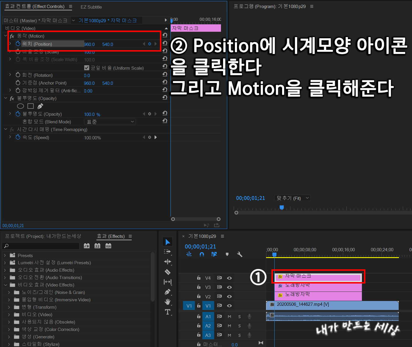 20. 프리미어프로 CC2019 타임라인에 V4 자막 마스크를 클릭한 후 왼쪽 상단에 Effect Controls에서 비디오에 Motion에서 Position에 앞에 시계 모양 아이콘을 클릭합니다