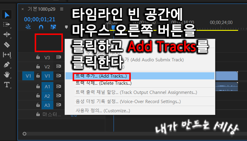 14. 타임라인 V3 위쪽에 빈 공간에 마우스 오른쪽 버튼을 클릭하고 중간에 Add Tracks를 클릭합니다