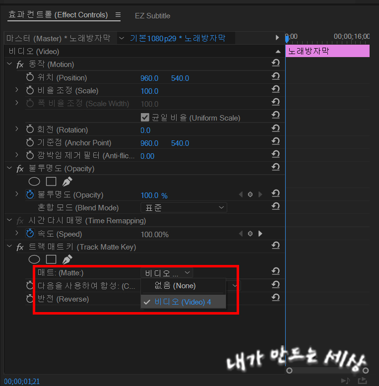 19. 왼쪽 상단에 Effect Controls에서 Track Matte Key에 Matte를 자막 마스크를 만들었던 파일을 설정하면 됩니다