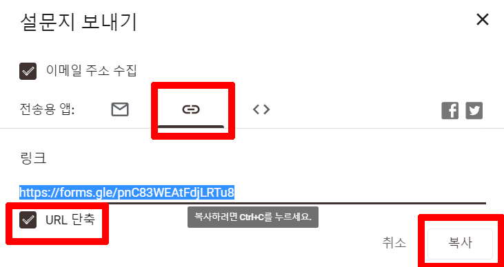 그리고 하단 오른쪽에 복사를 클릭하여 질문지 보낼 사람들에게 메신저 또는 문자로 보내주시면 됩니다