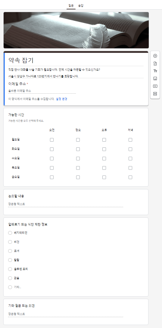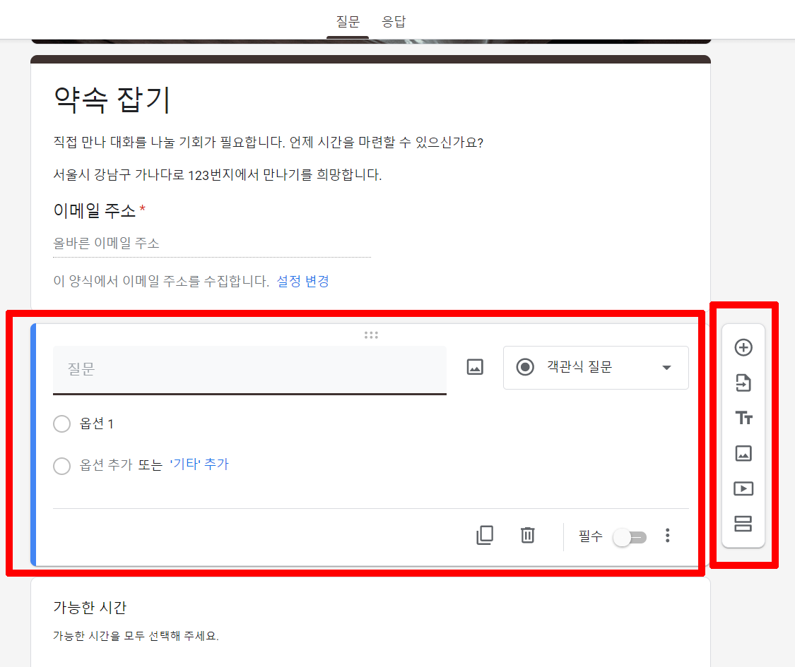 오른쪽 중간에 도구 메뉴가 있는데 질문을 추가하거나 이미지 추가, 동영상 추가 등 아이콘 위에 마우스 커서를 올려두면 자세한 내용을 확인할 수 있습니다. 필요한 게 있으면 아이콘을 클릭하여 추가하시면 됩니다