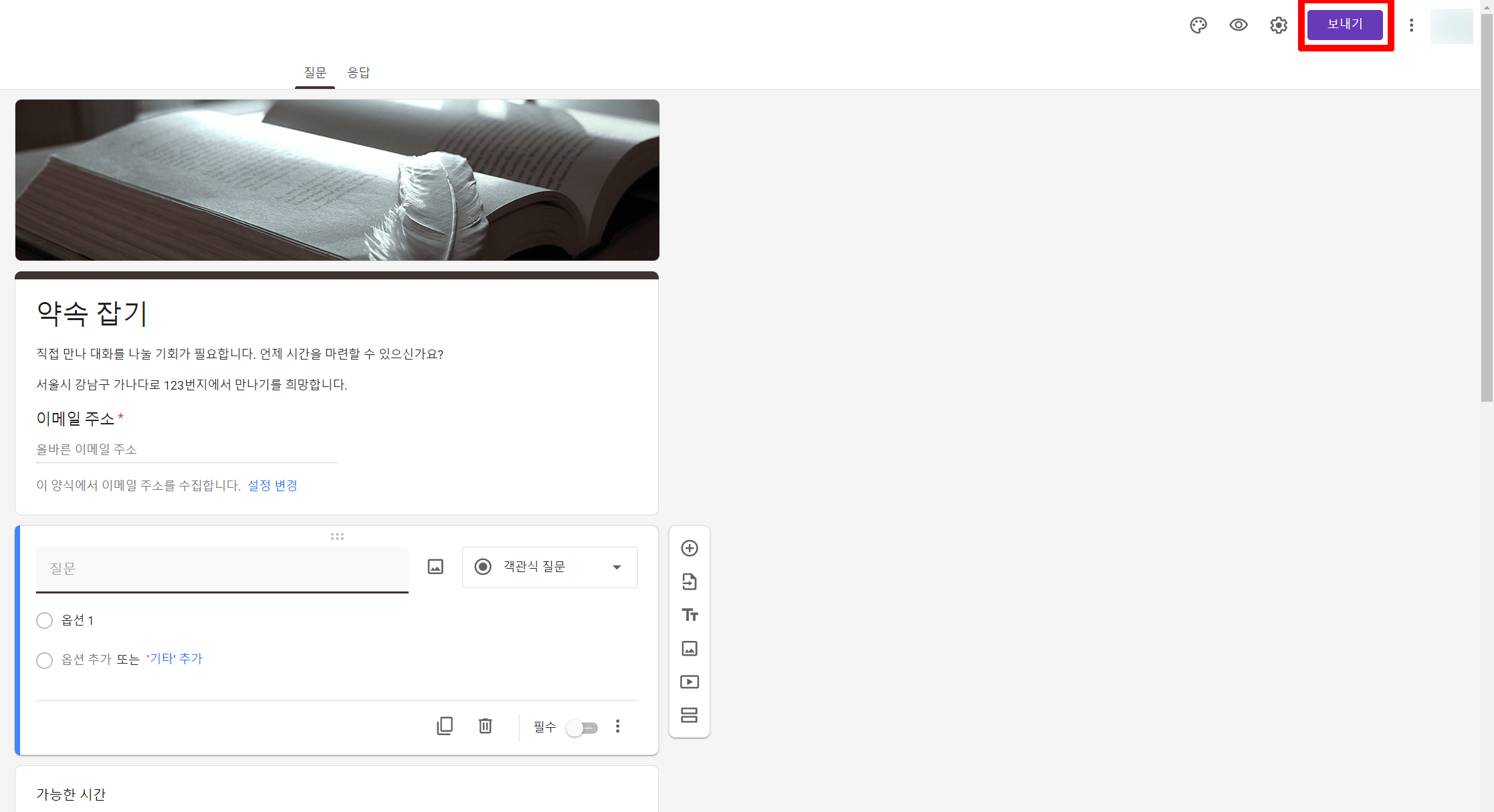 설문지 작성이 완료되었으면 오른쪽 상단에 보내기를 클릭합니다