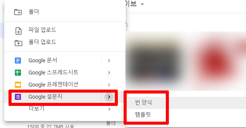 그러면 여러가지 구글 폼들을 볼 수 있는데 우리는 설문지를 만들려고 하기 때문에 구글 설문지 옆에 >를 클릭하면 빈 양식과 템플릿이 있는데 따로 구상해놓은 설문지가 없다면 템플릿을 선택합니다