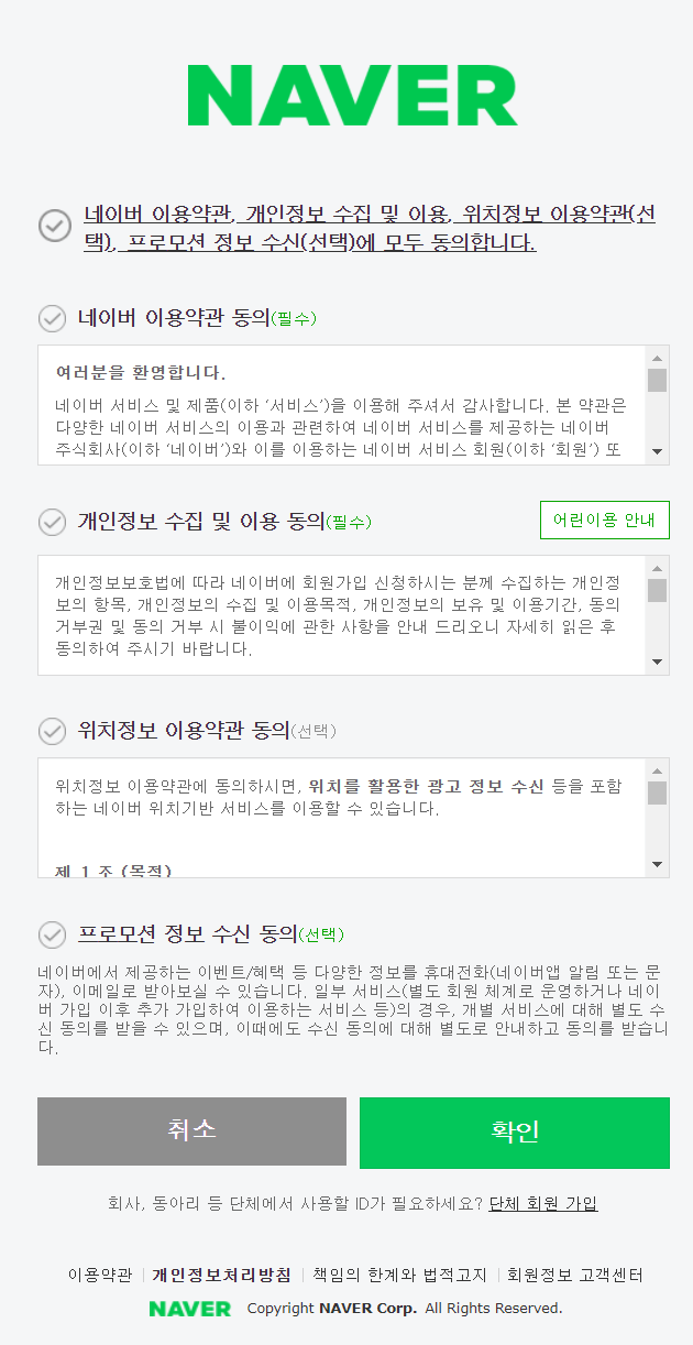 그럼 네이버 이용약관이 나오고 해당 항목들에 동의를 해주고 하단에 확인을 클릭하고 넘어갑니다. 그러면 구체적인 네이버 아이디, 비밀번호, 이름, 생년월일, 성별, 본인 확인 이메일 주소, 휴대전화 번호를 입력하고 인증번호를 받고 가입하기를 클릭하면 회원가입이 됩니다