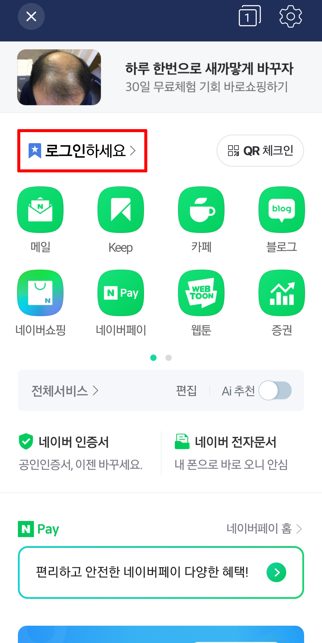 모바일에서 네이버 앱을 실행합니다. 왼쪽 상단에 3줄 아이콘을 클릭합니다. 그리고 로그인하세요를 클릭합니다