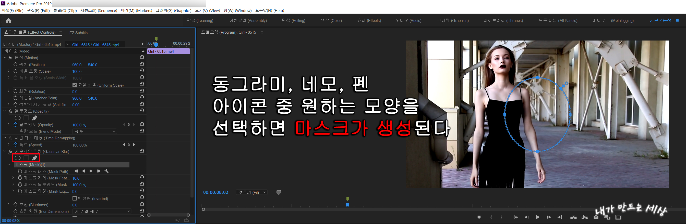 5. 프리미어프로 왼쪽 상단에 Effect Controls(효과 컨트롤) 창에 Gaussian Blur(가우시안 흐림)에서 동그라미, 네모, 펜 아이콘 중 원하는 모양을 선택하면 마스크가 생성 됩니다