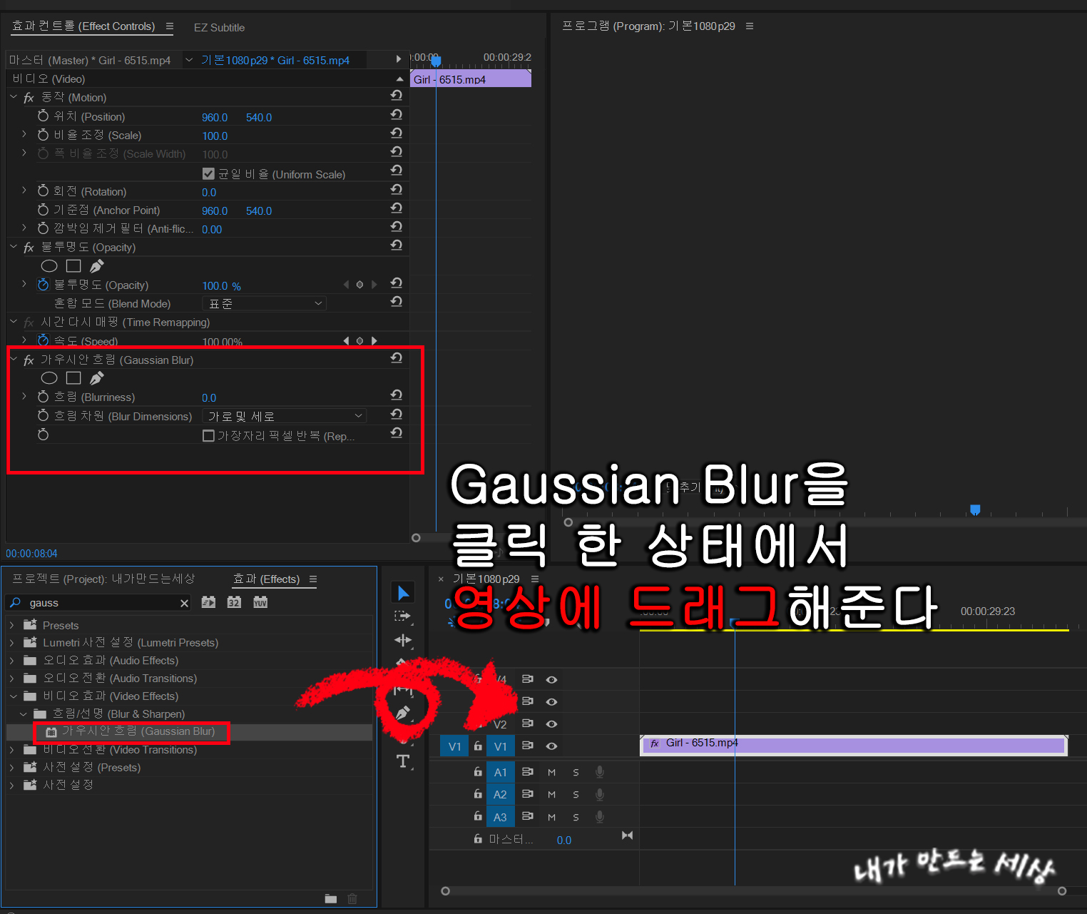 4. 검색한 Gaussian Blur(가우시안 흐림)을 클릭 후 드래그해서 영상에 놔줍니다