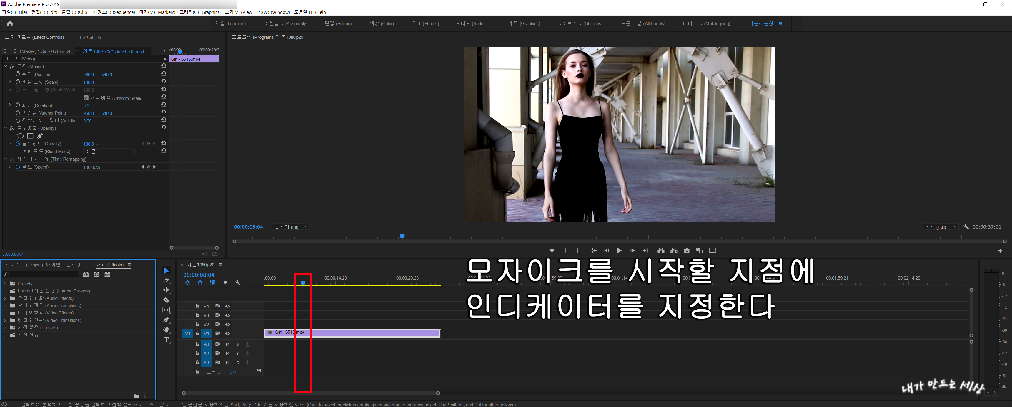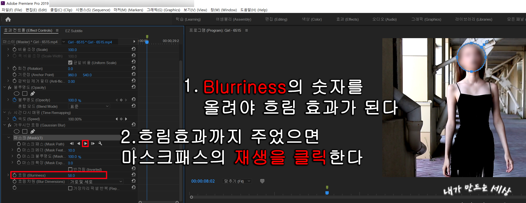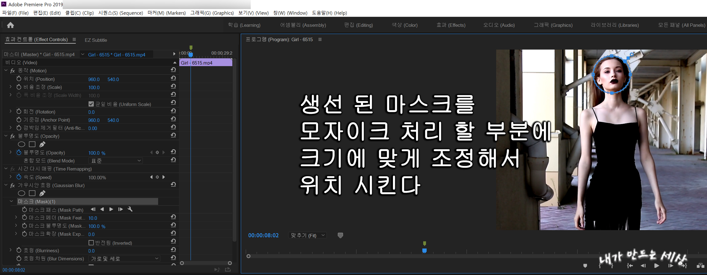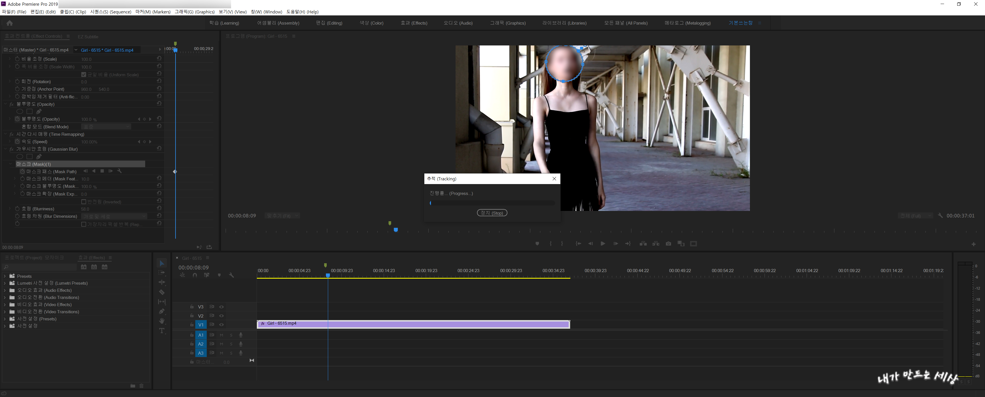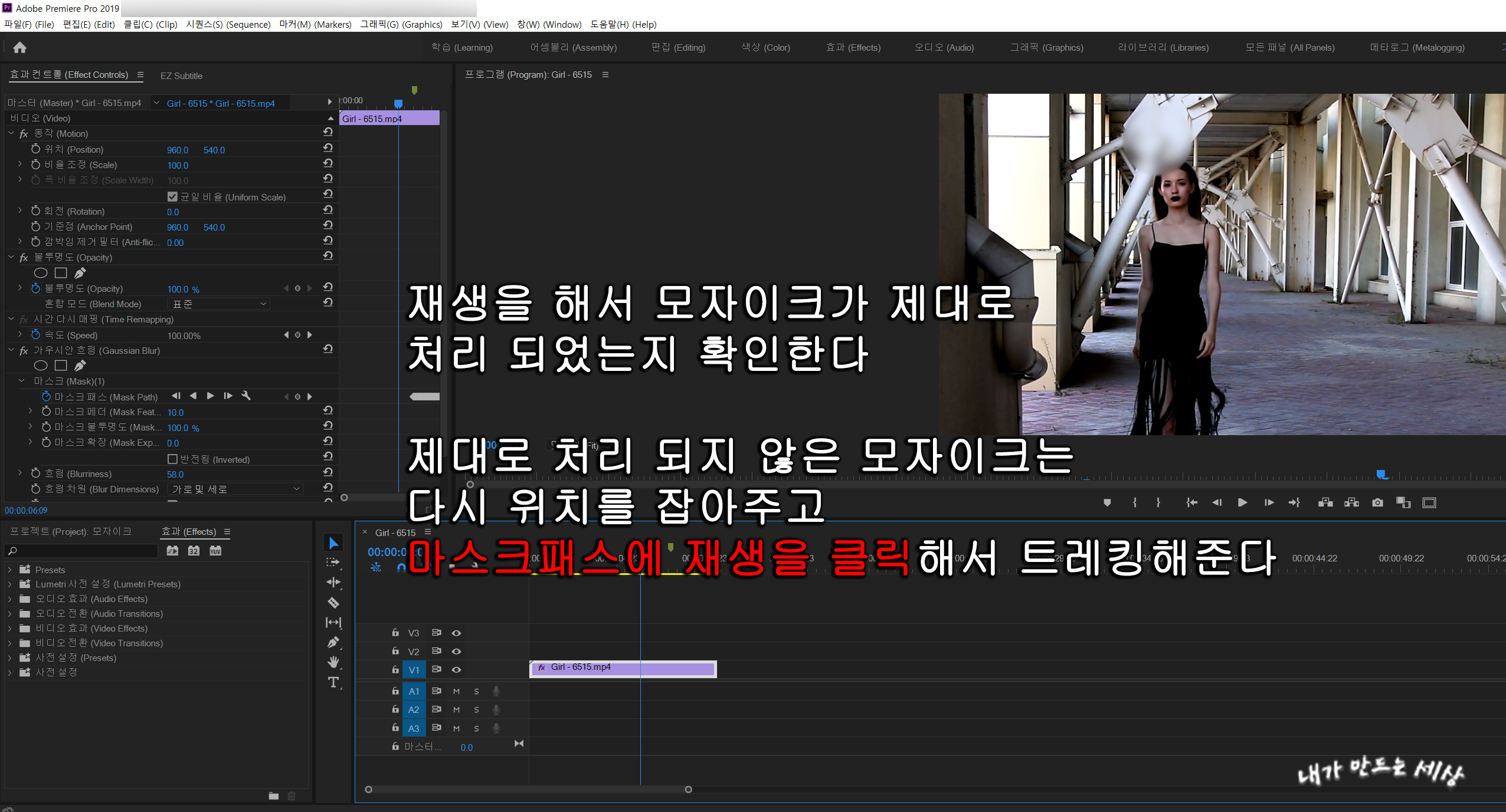 9. 프리미어프로 cc2019에서 트래킹이 끝나면 영상을 재생해서 모자이크가 제대로 처리되었는지 확인합니다