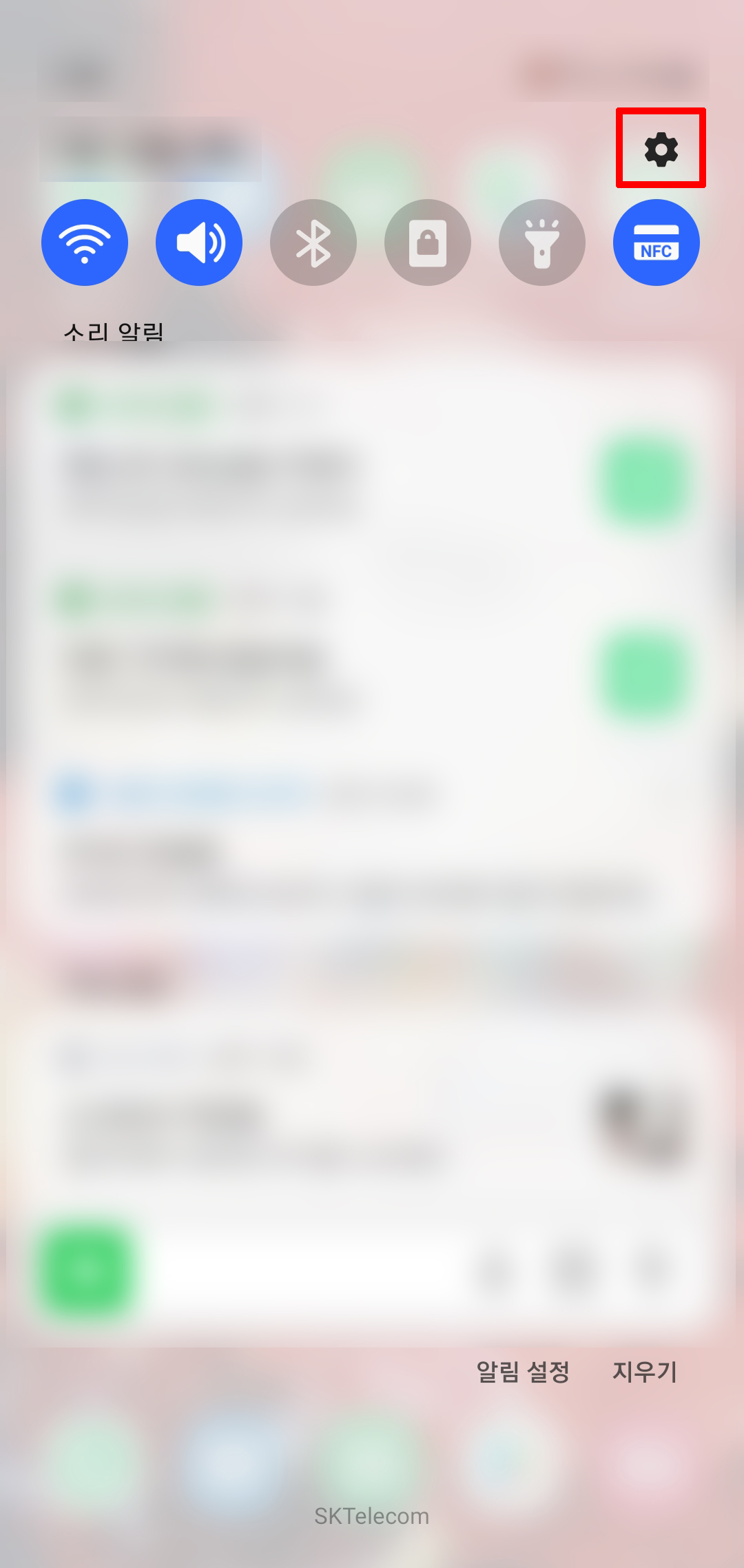 갤럭시 설정으로 실행해야합니다. 빠른 실행으로 화면 맨 위를 손으로 쓸면서 내려주면 알림 창이 나옵니다. 오른쪽 맨 위에 있는 톱니바퀴 모양 아이콘을 클릭합니다