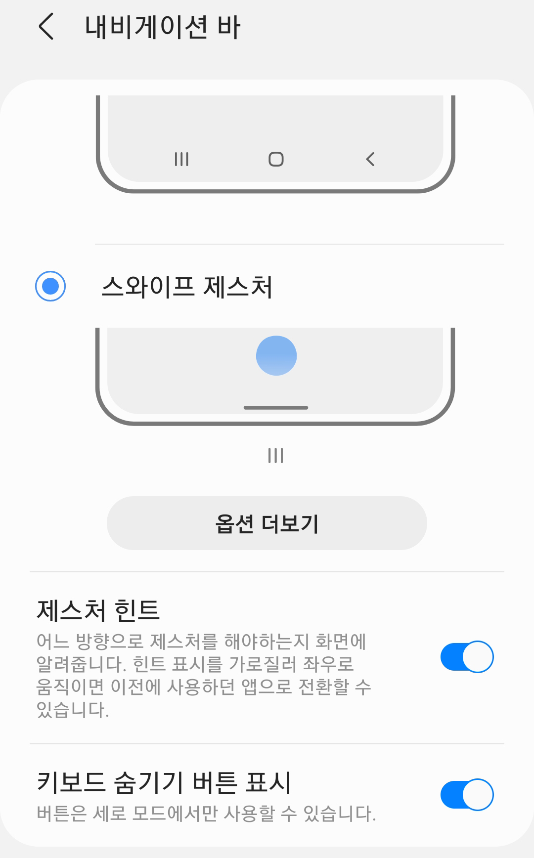 스와이프 제스처를 선택했다면 제스처 힌트와 키보드 숨기기 버튼 표시를 설정할 수 있습니다. 원하시는 분들은 설정해주시면 됩니다. 원지 않는 분들은 해제하시면 됩니다