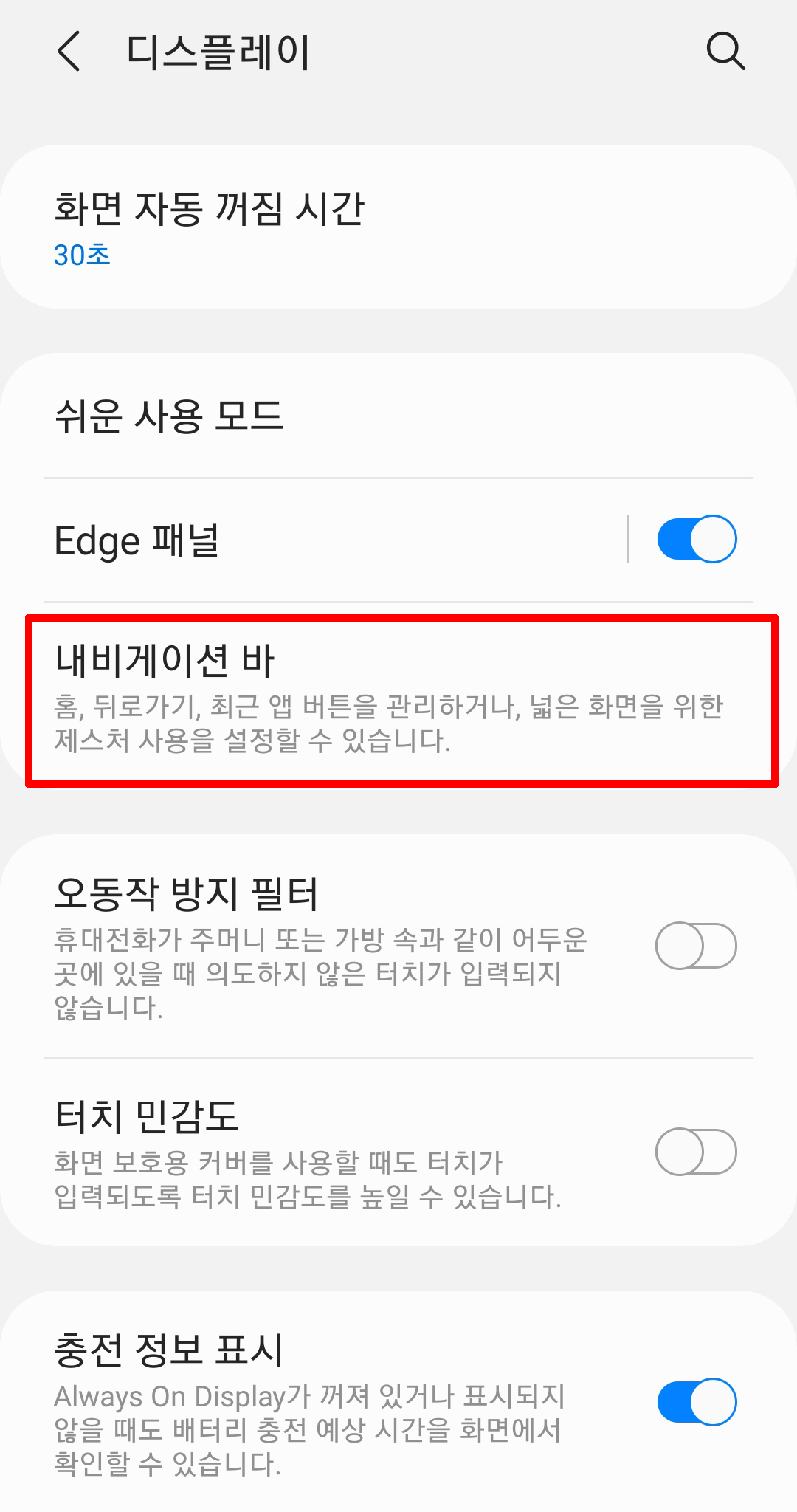 디스플레이로 이동하면 다시 스크롤을 내려줍니다. 내비게이션 바를 클릭합니다