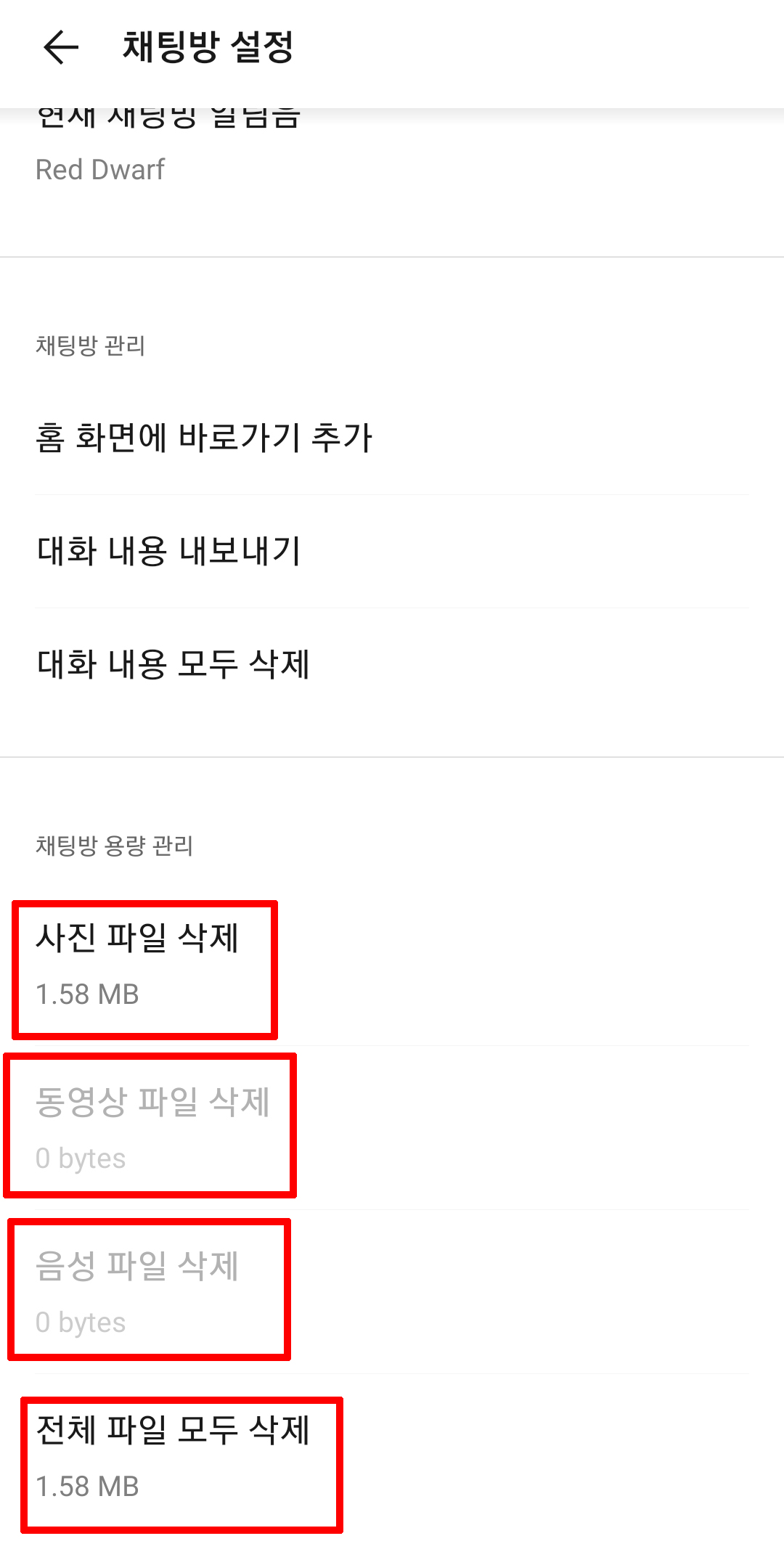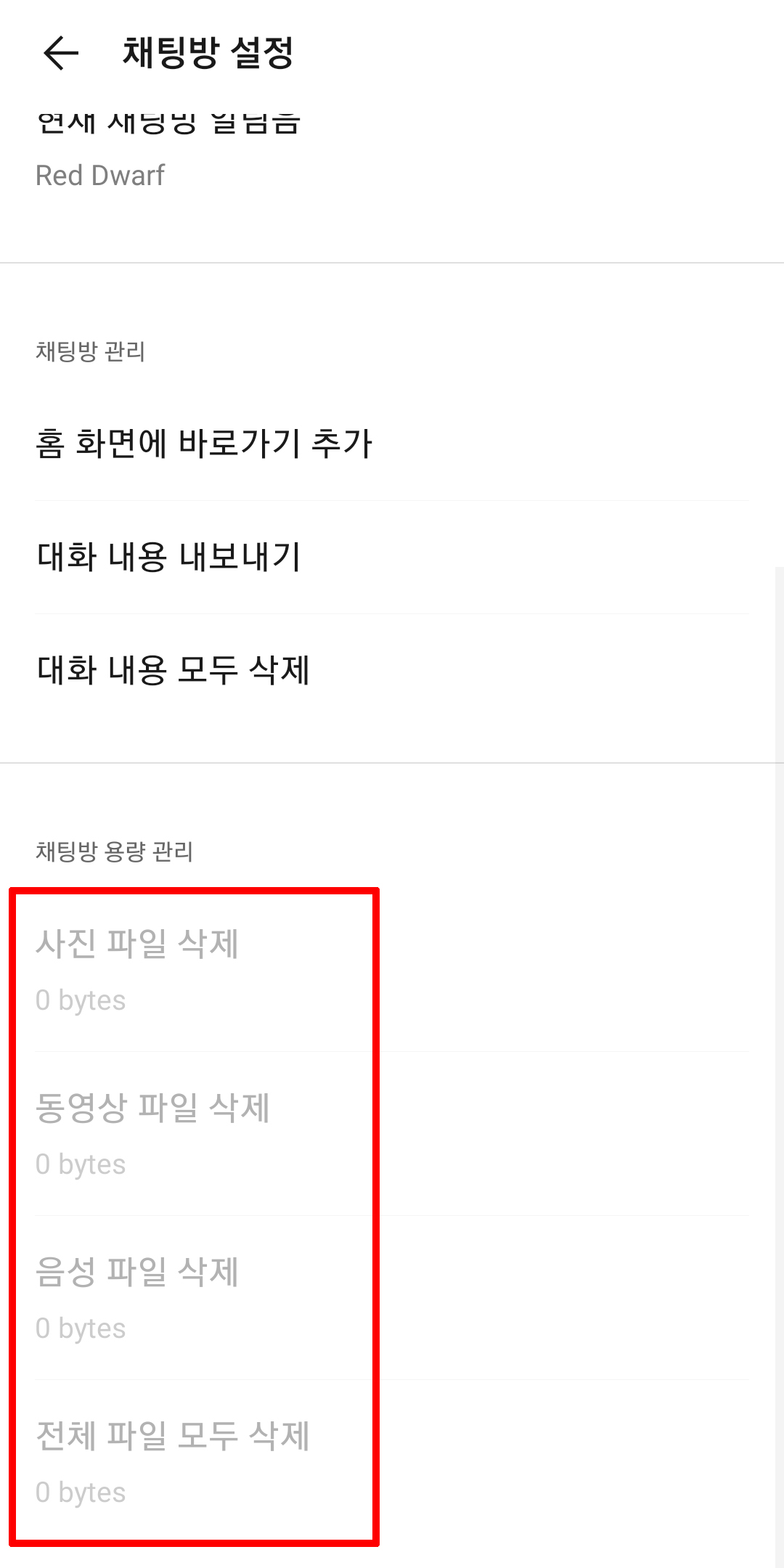 모두 삭제가 끝나면 아래 사진처럼 글씨들이 비활성화가 되고 파일 용량이 0으로 표기됩니다. 카톡 대화방에 있던 불필요한 파일들의 캐시가 삭제되면서 핸드폰의 용량도 확보된 걸 확인할 수 있습니다