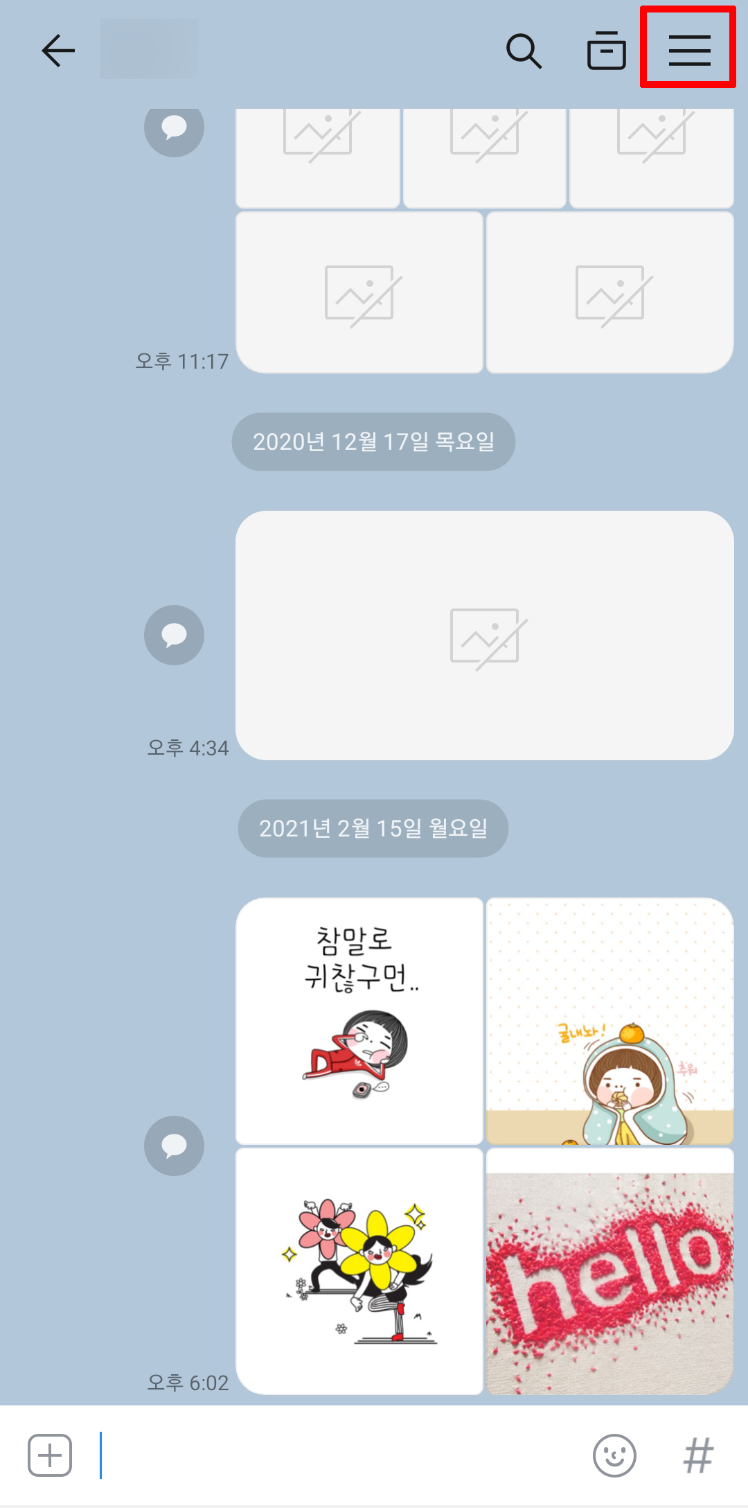 카카오톡을 실행하고 대화방 중 사진 및 영상 등 파일들을 많이 올리고 받는 대화방으로 들어갑니다. 대화방 오른쪽 맨 위에 줄3개 아이콘을 클릭합니다