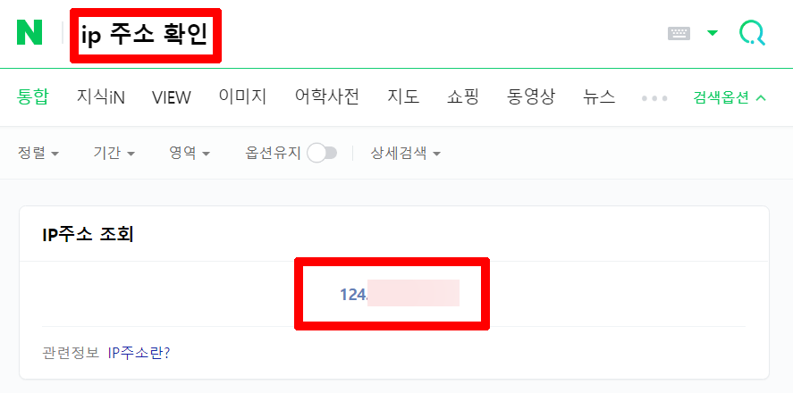 인터넷 창을 열고 네이버로 접속합니다. 네이버 검색창에 ip 주소 확인이라고 입력하고 검색합니다. 그러면 ip 주소 조회란에 내 컴퓨터의 아이피 주소 12자리가 나옵니다