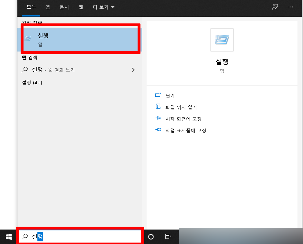컴퓨터를 실행한 상태에서 윈도우 10 버전 기준으로 왼쪽 맨 아래에 있는 검색창에 실행이라고 검색하면 실행 앱이 보입니다. 실행 앱을 클릭합니다