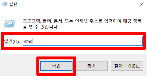 실행 창이 열리면 열기 칸 안에 cmd 라고 입력하고 확인을 클릭합니다