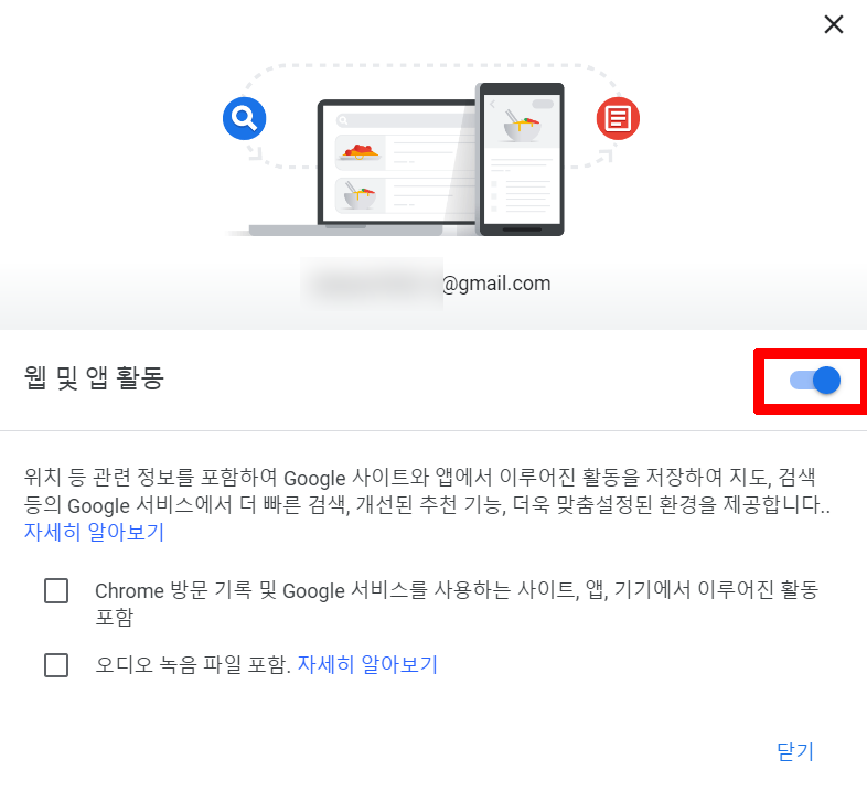 창이 하나 생성되고 웹 및 앱 활동 옆으로 이동하는 버튼이 파란색으로 되어 있으면 검색기록에 대한 저장 기능이 활성화돼있기 때문에 버튼을 클릭하여 비활성화 시킵니다