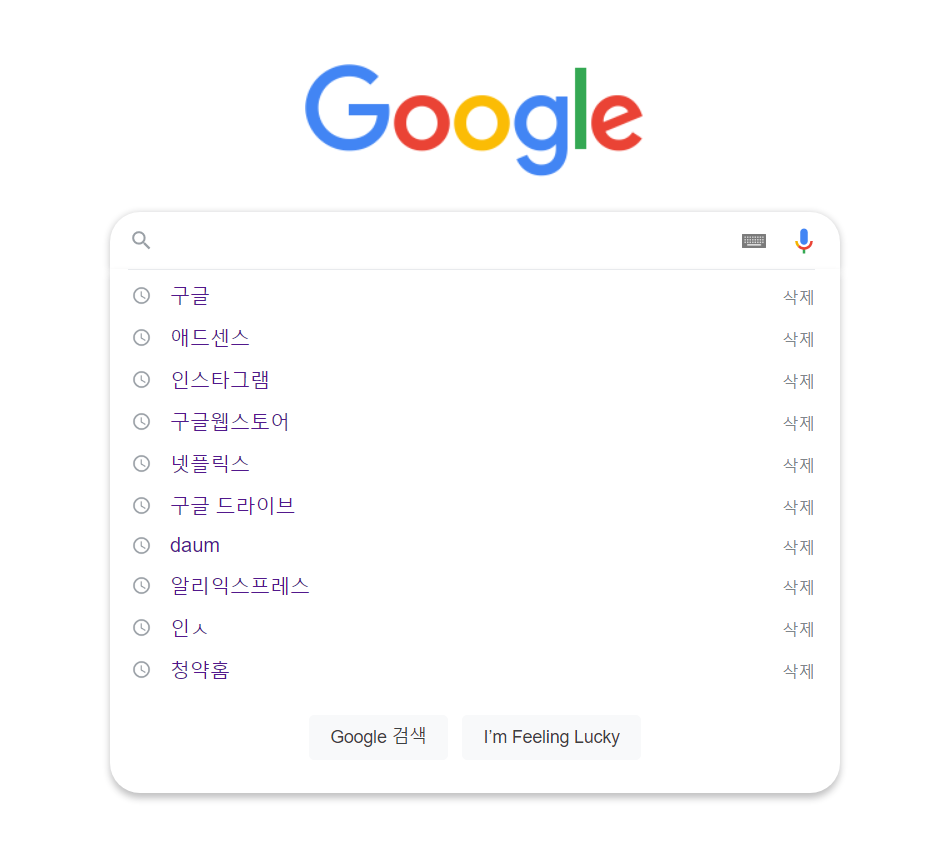 인터넷 창을 열고 구글로 접속합니다. 검색창에 그동안 검색했던 검색어들이 나오는 걸 확인할 수 있습니다. 공용으로 사용하고 있는 컴퓨터나 회사에서 이렇게 노출되는 게 싫으신 분들은 검색기록을 삭제하고 싶으실 텐데요. 하나씩 삭제하는 건 너무 번거롭기 때문에 기록이 남지 않게 설정하는 게 편하고 안전합니다