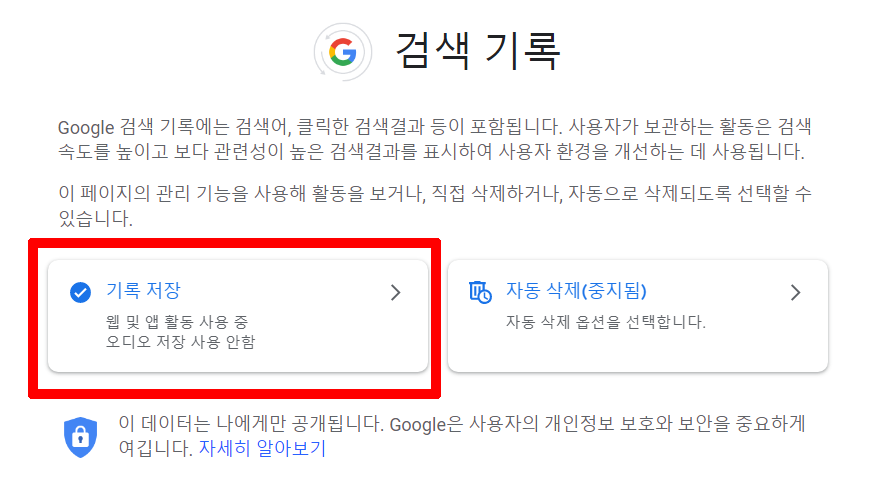 그래서 저처럼 정보 유출에 민감하거나 공용 PC를 사용하시는 분들에게는 필히 구글 검색기록 끄기를 설정하여 정보 유출을 보호하시길 바랍니다