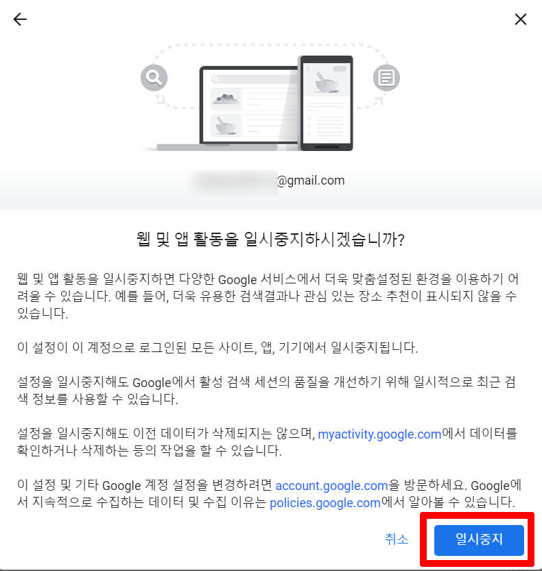 비활성화를 했으면 다시 새창이 뜨고 웹 및 앱 활동을 일시 중지하시겠습니까?라는 내용의 창이 뜹니다. 내용을 확인해보시고 검색기록 끄기를 원하시면 아래에 있는 일시중지 버튼을 클릭합니다