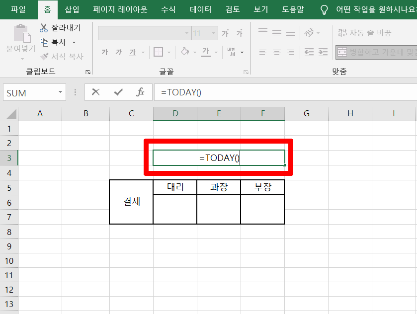 보고서를 매일 제출해야되는 문서 같은 경우 날짜를 매번 입력해야하는데 날짜 입력하는 칸에 =TODAY() 를 입력해줍니다. 그러면 컴퓨터에 있는 날짜를 기반으로 변경 되기 때문에 수정할 필요 없이 사용할 수 있습니다