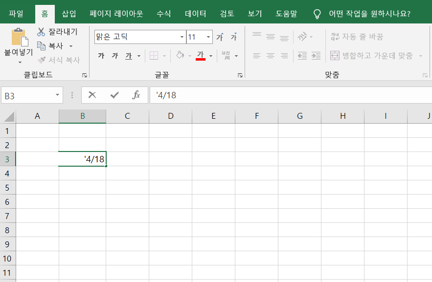 날짜로 자동 변환되지 원지 않고 4/18이 나오게 입력하고 싶으면 '4/18 이라고 입력해주면 됩니다. 엔터키 옆에 있는 키를 누르면 됩니다