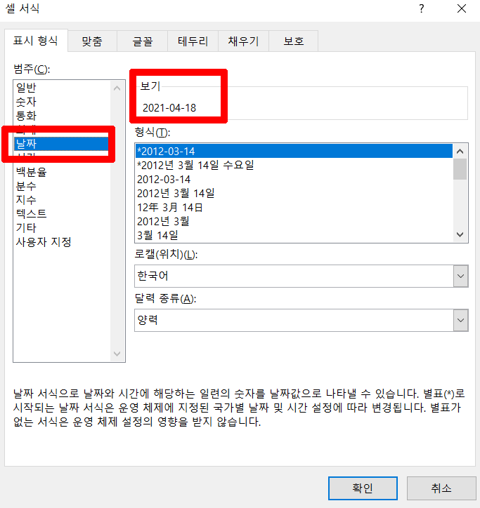 셀 서식 왼쪽에 있는 범주에서 날짜를 선택하면 형식란에 여러가지 날짜 형식들이 나옵니다. 그중 변경하고 싶은 형식으로 선택해주면 위쪽에 보기란에 미리 볼 수 있습니다