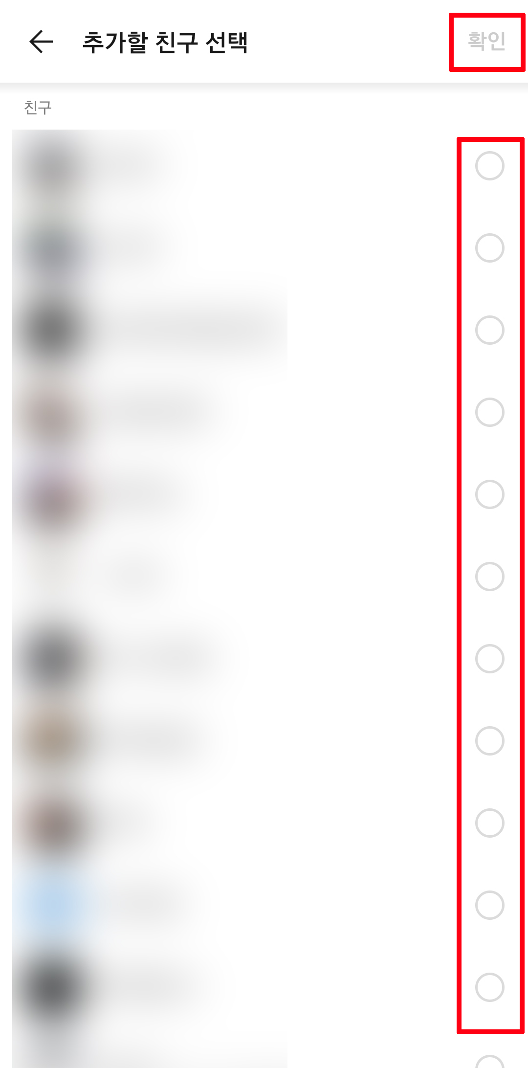 추가할 친구 목록이 나옵니다. 그중 새로 만든 프로필을 보게 할 친구들을 선택합니다. 다 됐으면 오른쪽 맨 위에 있는 확인을 클릭합니다