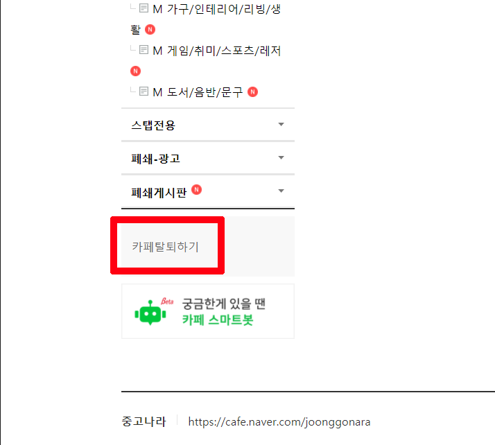 본인이 탈퇴하고자 하는 카페로 접속했으면 맨 아래로 내려갑니다. 그러면 왼쪽 카테고리 목록에 카페 탈퇴하기가 있습니다. 그걸 클릭합니다