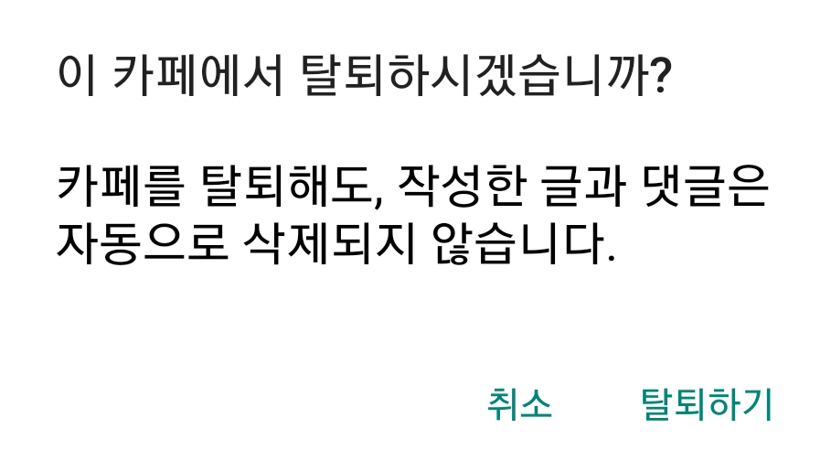카페 탈퇴하기를 클릭하면 작은 창이 뜹니다. 여기서 확인을 클릭하면 탈퇴가 처리됩니다. 주의해야 할 점은 카페 탈퇴 시 카페 내에서 본인이 작성했던 글이나 댓글들은 삭제가 되지 않기 때문에 본인이 남긴 글들이나 댓글을 삭제하기 원하는 분들은 탈퇴 전 먼저 삭제하시고 탈퇴를 진행하시면 됩니다