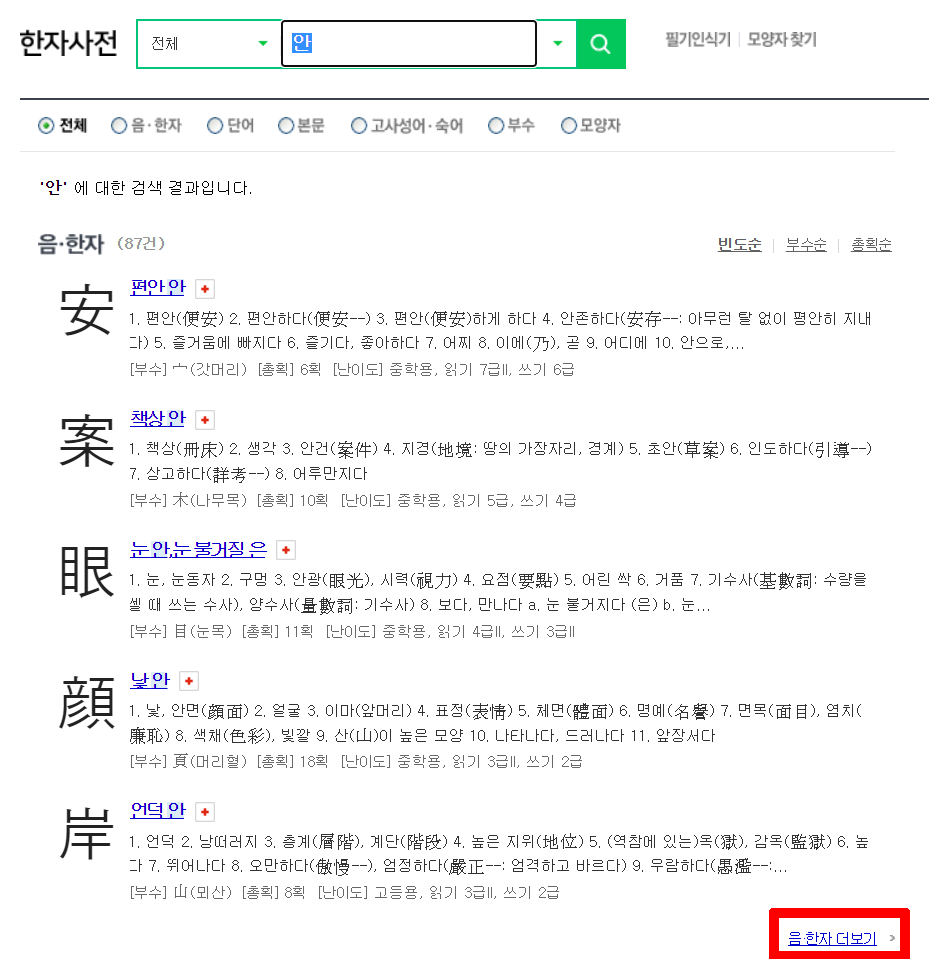 본인에게 맞는 방법으로 검색했다면 음이 같은 여러 한자들이 나오는 경우 내가 찾고자 하는 한자가 안 보인다면 아래에 오른쪽에 음 한자 더보기를 클릭하여 찾아보시기 바랍니다