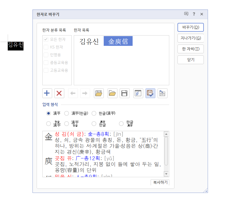 한글 오피스 같은 경우 위인의 이름이나 유명인 같은 경우 자동적으로 풀네임에 대한 변환모드가 지원 되기 때문에 이름을 통째로 마우스로 드래그 해서 영역을 잡고 한자 키를 누르면 등록된 한자 이름이 나와 한번에 변환할 수 있습니다