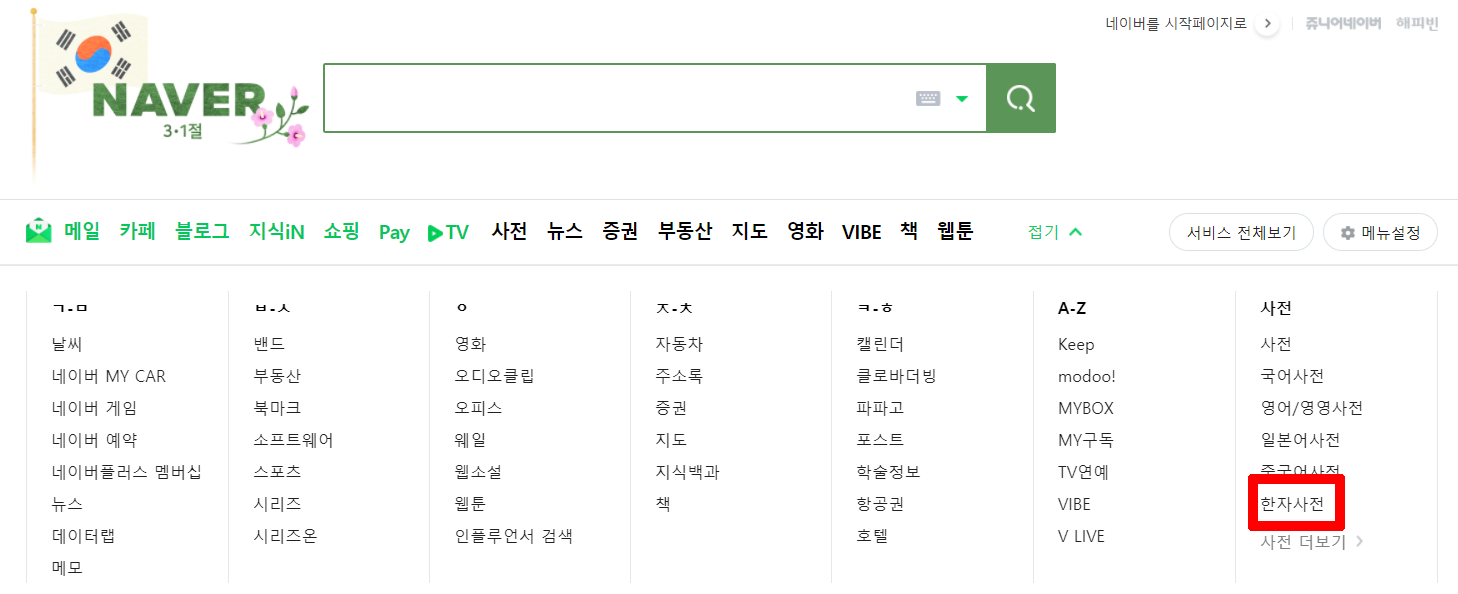 네이버로 접속하여 검색창 아래에 메일, 카페 등 여러 메뉴들 중 웹툰 옆에 있는 접기를 클릭합니다. 거기서 오른쪽에 있는 사전에서 한자 사전을 클릭합니다