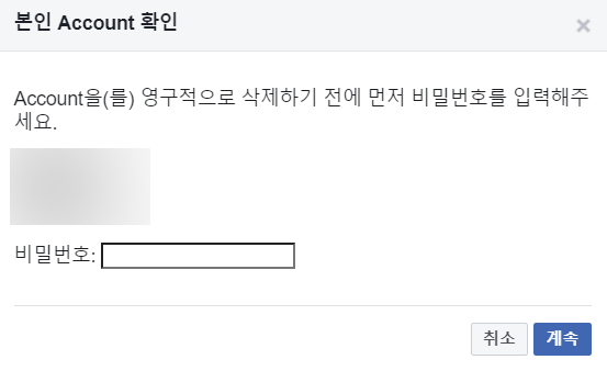 마지막으로 본인의 계정 비밀번호를 입력후 계속을 진행하면 페이스북 탈퇴 처리가 됩니다